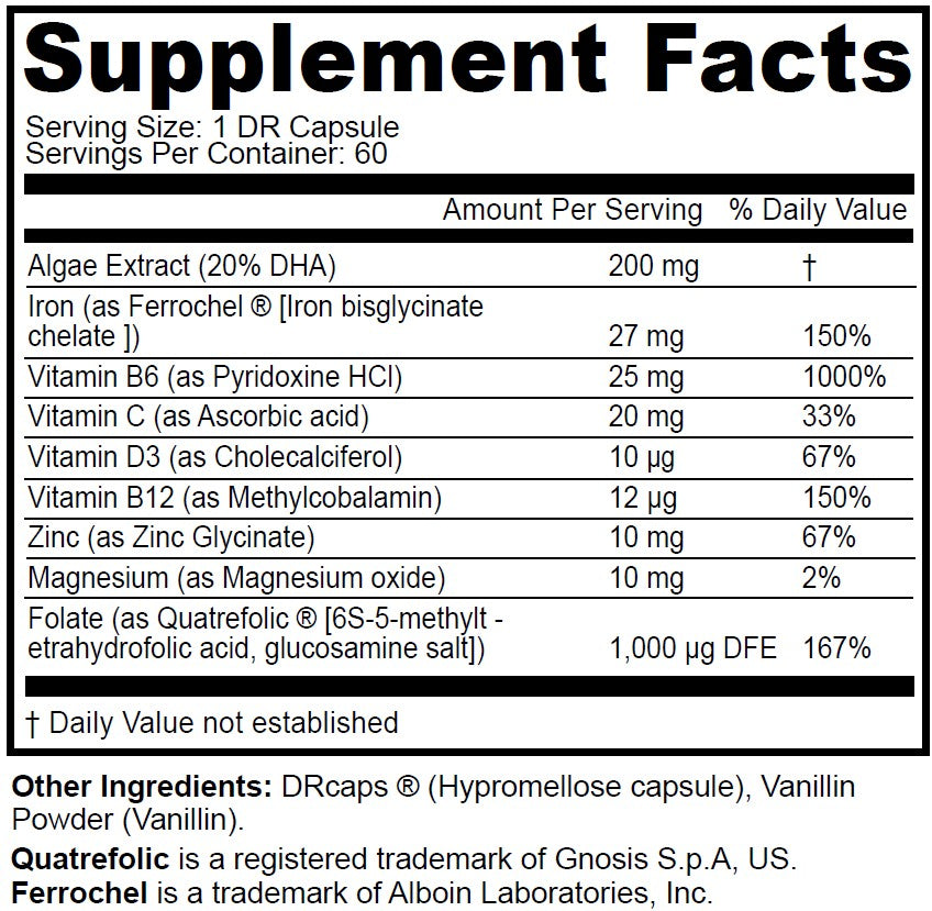 - Provide 1mg Quatrefolic® & 27mg Ferrochel™